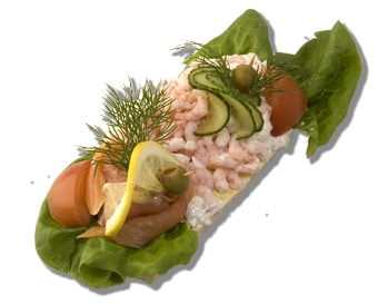 Landgång med handskalade MSC-märkta räkor och kallrökt lax.