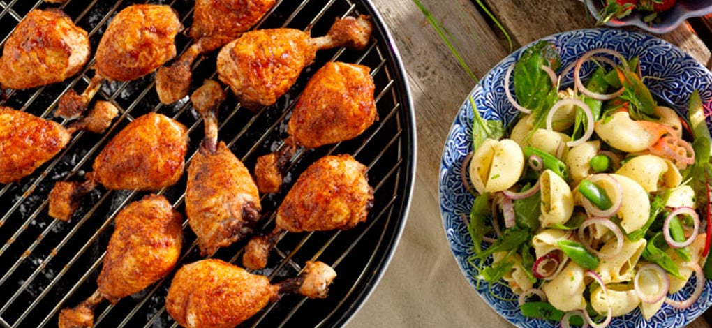 Kycklingklubbor, lufttorkad skinka, solmogna röda tomater*, oliver*, saftig apelsin* och basilika.
